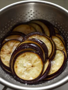 Preparation- Thinly slice the eggplant/aubergines, place them in a colander, sprinkle lightly with salt, and set aside for 1 hour to drain excess water.