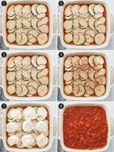 - Layer the eggplant slices, followed by Parmesan cheese, mozzarella, pepper, and tomato sauce. Repeat until you have one layer left.