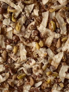 - Sprinkle the remaining coconut flakes, chocolate chips, and pistachios on top.