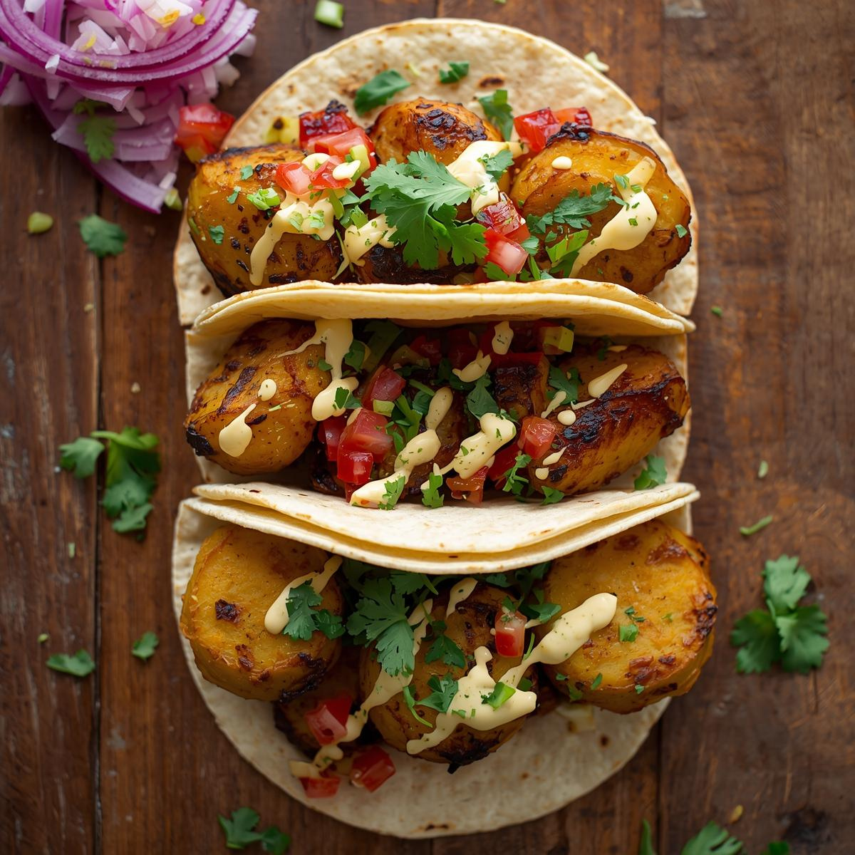 - Serve the cooked potatoes on tortillas with your favorite toppings such as shredded lettuce, chopped tomatoes, and vegan cheese. Drizzle with salsa or your favorite sauce.